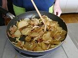 包丁の安全な使い方を学び、ジャガイモと玉ねぎ、ベーコンを切りました。ジャガイモを茹でている間に玉ねぎとベーコンを炒めます。