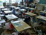 5校時に引き渡し訓練が行われました。地震が起きたことによる避難訓練です。一斉に机の下にもぐります。