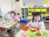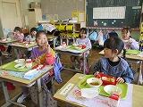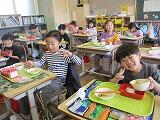 1年生の初めての給食は、ポークカレー、華風サラダ、お祝いいちごクレープ、ごはん、牛乳でした。みんなニコニコ顔で食べていました。